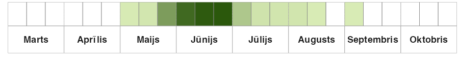 Tauriņa lidošanas laiks. Krāsas intensitāte proporcionāla ziņojumu skaitam portālā www.dabasdati.lv attiecīgā mēneša dekādē. |